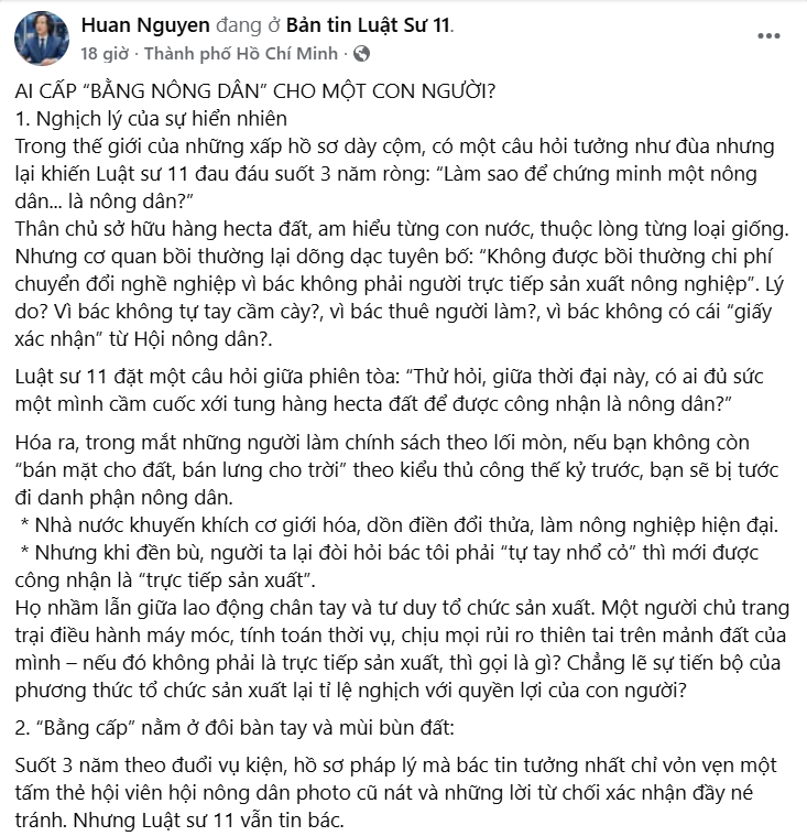 Nên luật sư đồng nghiệp mới đặt câu hỏi: “AI CẤP “BẰNG NÔNG DÂN” CHO MỘT CON NGƯỜI?” “Bằng nông dân” ở đây chính là giấy tờ hay thứ gì đó tương đương có giá trị chứng minh ông A là người trực tiếp sản xuất nông nghiệp và đang sử dụng đất nông nghiệp.
