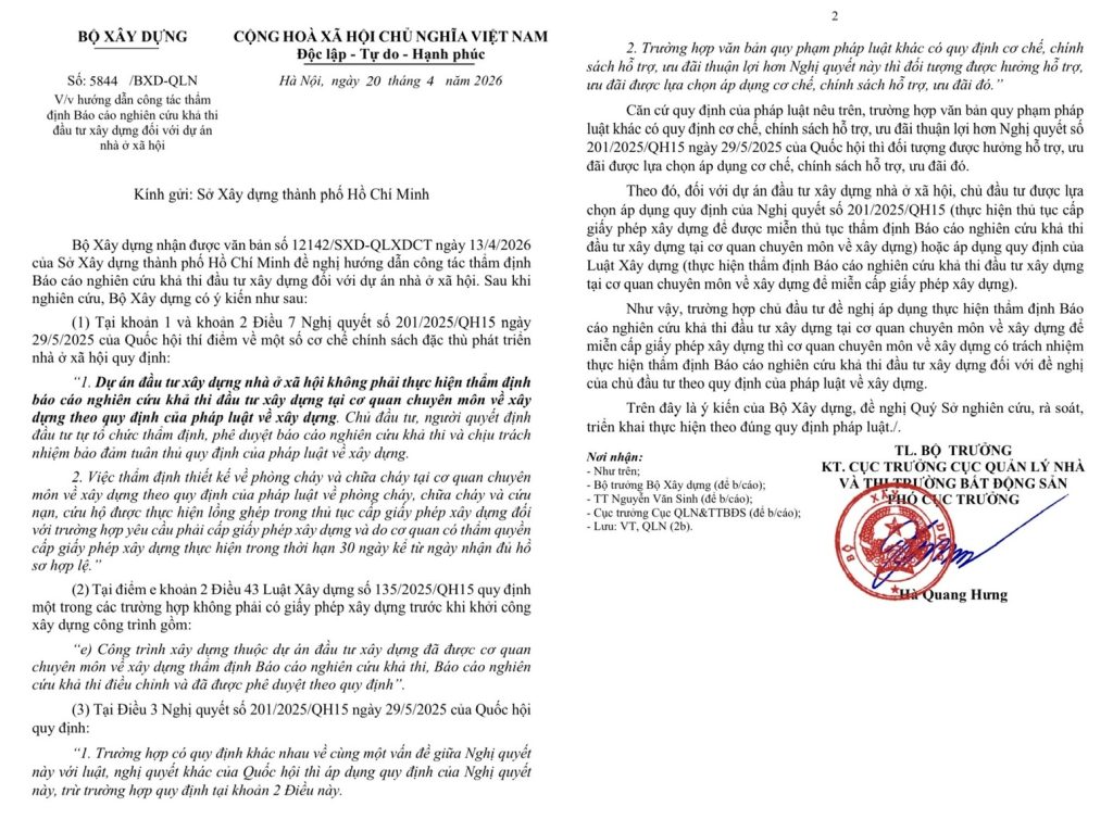 Những ngày qua, các chủ đầu tư dự án nhà ở xã hội đang vui mừng chia sẻ văn bản số 5844/BXD-QLN ngày 20/4/2026 của Bộ Xây dựng trả lời Sở Xây dựng TP HCM để hướng dẫn thẩm định báo cáo nghiên cứu khả thi nhằm miễn giấy phép xây dựng đối với dự án nhà ở xã hội.